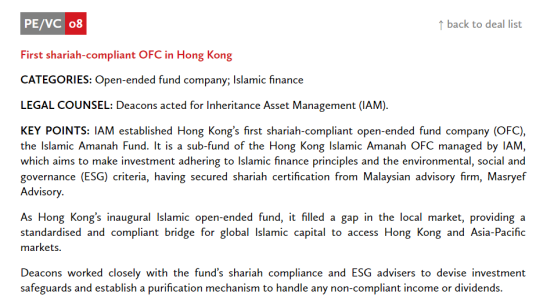 传承资产管理有限公司凭借“香港首支伊斯兰开放式基金”,从数千项申报案例中脱颖而出,荣耀上榜,并被刊登于顶级法律商业期刊《商法》杂志上。